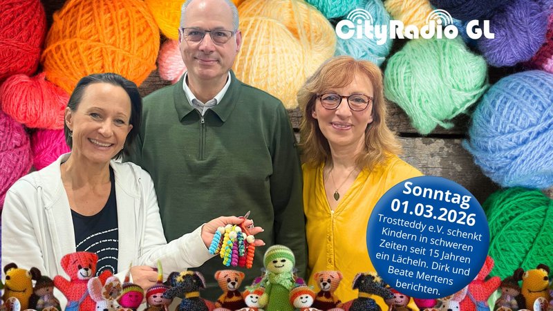 In dieser Sendung von "CityRadio GL" sprechen die Moderator*innen Martin Hardenacke, Nicola Henselmann und Werner Bauschert über Neuigkeiten aus Bergisch Gladbach. Dabei geht es unter anderem um Bauarbeiten an einer Schule, die Schließung des Bergischen Museums in Bensberg und neue Führungen auf dem Zanders Areal. Auch Gäste sind im Studio: die Vorsitzenden des Vereins "Trostteddy e.V.". Sie erzählen im Interview mit Moderatorin Nicola Henselmann, dass die handgefertigten Teddys Kindern in Notlagen Trost spenden sollen.
