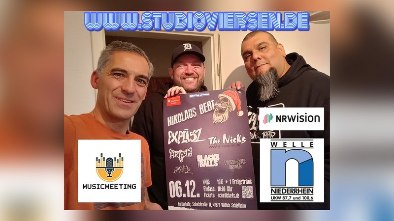 Am 6. Dezember 2025 findet in der Kulturhalle Willich-Schiefbahn erstmals das Festival "Nikolaus bebt" statt. Insgesamt sechs Bands stehen dabei auf der Bühne: "Nagen", "Fiend Club Anrath", "Black & Balls", "Artery", "The Nicks" und "Explisz". Organsiert wird "Nikolaus bebt" von Christoph Heyes und Eduardo Cadima. Zu Gast bei Moderator Daniel Gartz sprechen sie in "MusicMeeting" über die Herausforderung der Festivalorganisation, stellen die teilnehmenden Bands vor und diskutieren die aktuelle Lage der Musikszene in Viersen.